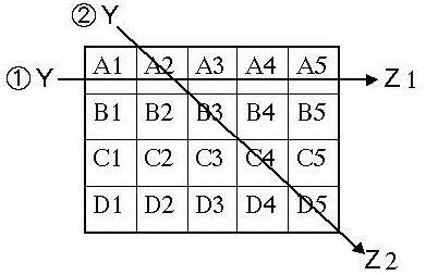 れ図のようにA1~D5とします。このマス目全体にいろいろな方向から決まった量(Y)のX線